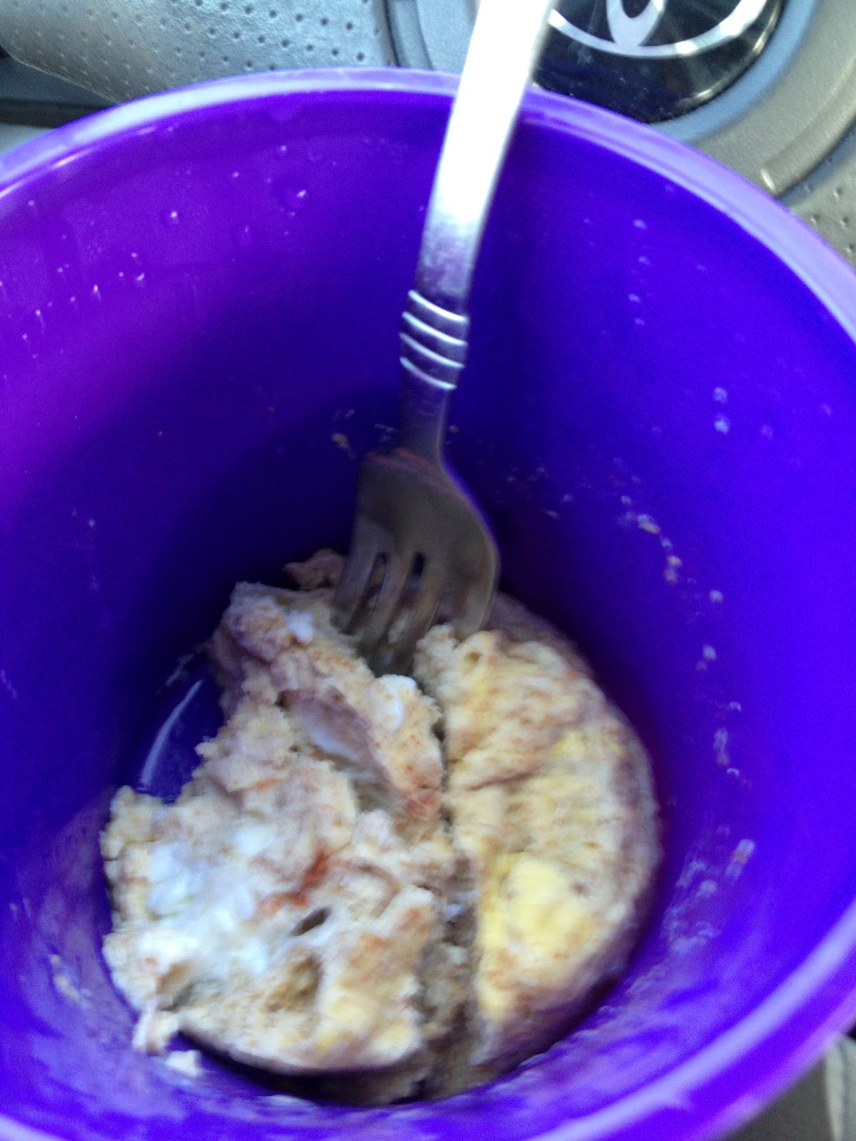 I wanted to share with you my "micro-scrambled" eggs that I eat almost every morning. Do you ever think you don't have enough time for breakfast? Never fear with these eggs! Simply crack an egg or two in a coffee mug, add in approx 1 tbsp water per egg, scramble with a fork, and microwave! It literally takes 1-2 minutes for your eggs to be done. Some tips: Spray the inside of your mug with non-stick spray. It will be much harder to clean if you don't spray before! When the eggs are done, use your fork to break it up. It will be one big egg chunk (that sounds disgusting) but if you break it up, it will be a much more familiar consistency. Add seasonings! Add cheese! From plain with S&P, to spicy with hot sauce and salsa, or cheesey with err cheese, you can be creative and have a yummy breakfast quick! Today I kept it simple, since of course I was still doing the detox. Just 2 eggs, a bit of water, and a scoop of ground golden milled flax. PS If you are adding flax for the nutrients, you're going to have to add more water. It absorbs most of the water! If you don't use flax, then you will have a bit of water in the bottom of the mug when you're done.